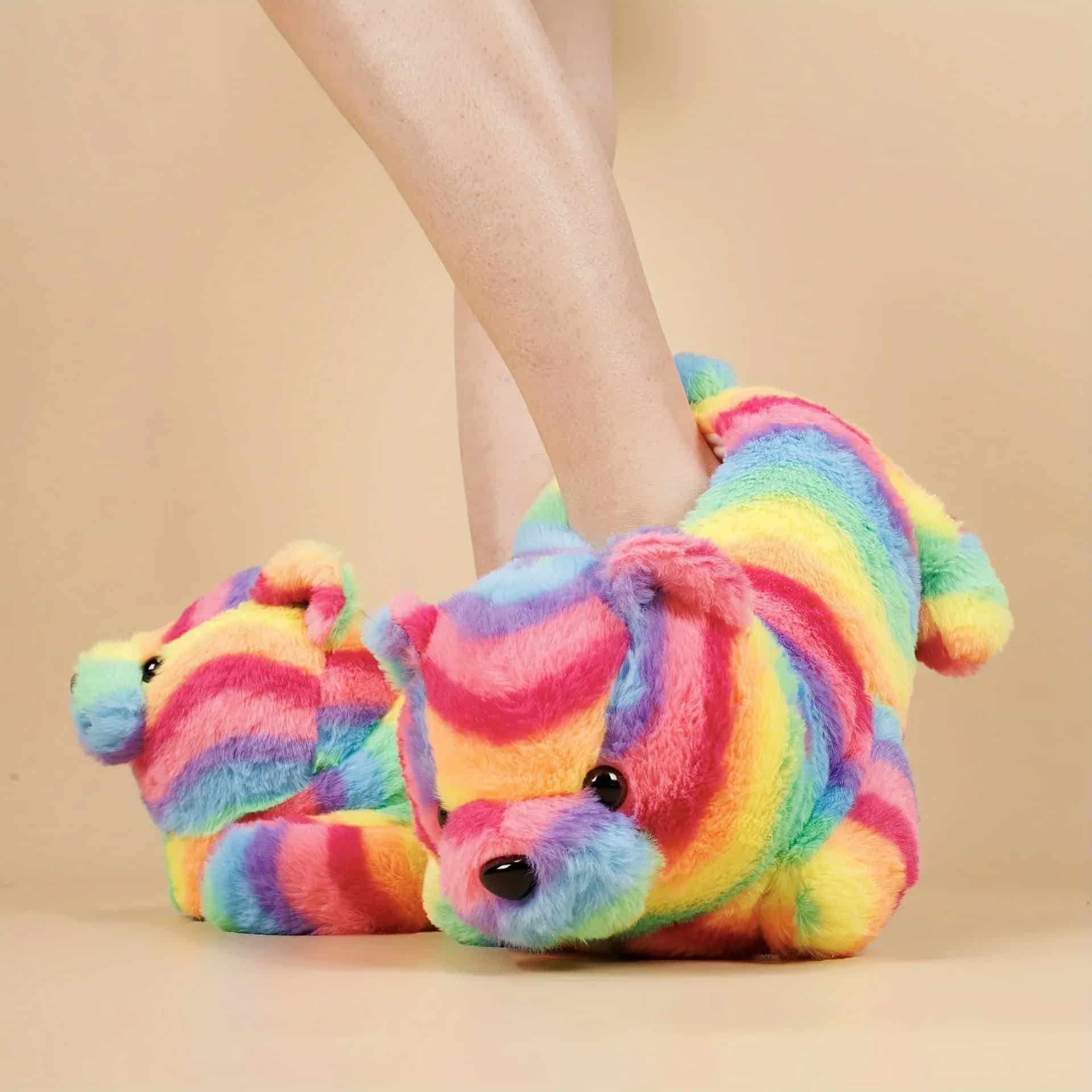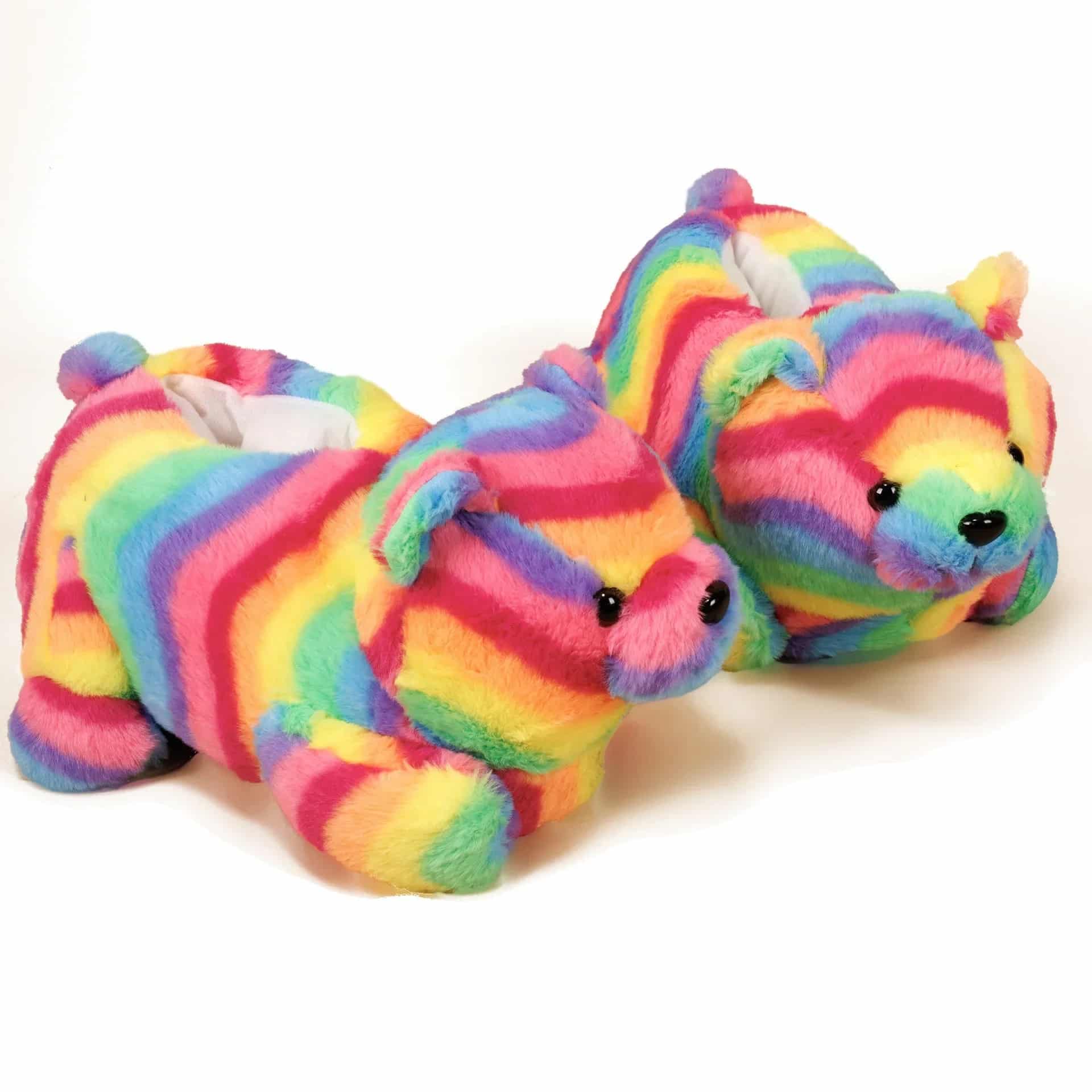Nos chaussons adoptent la forme adorable d’un chien aux couleurs vives et joyeuses qui rappellent un arc-en-ciel.
