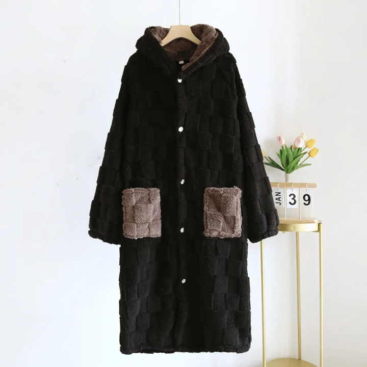 Principalement noire avec un motif carrés en relief, elle se distingue par ses détails raffinés : deux grandes poches frontales en tissu marron contrastant, idéales pour garder vos essentiels à portée de main, et une capuche doublée assortie, parfaite pour garder la tête et le cou au chaud.