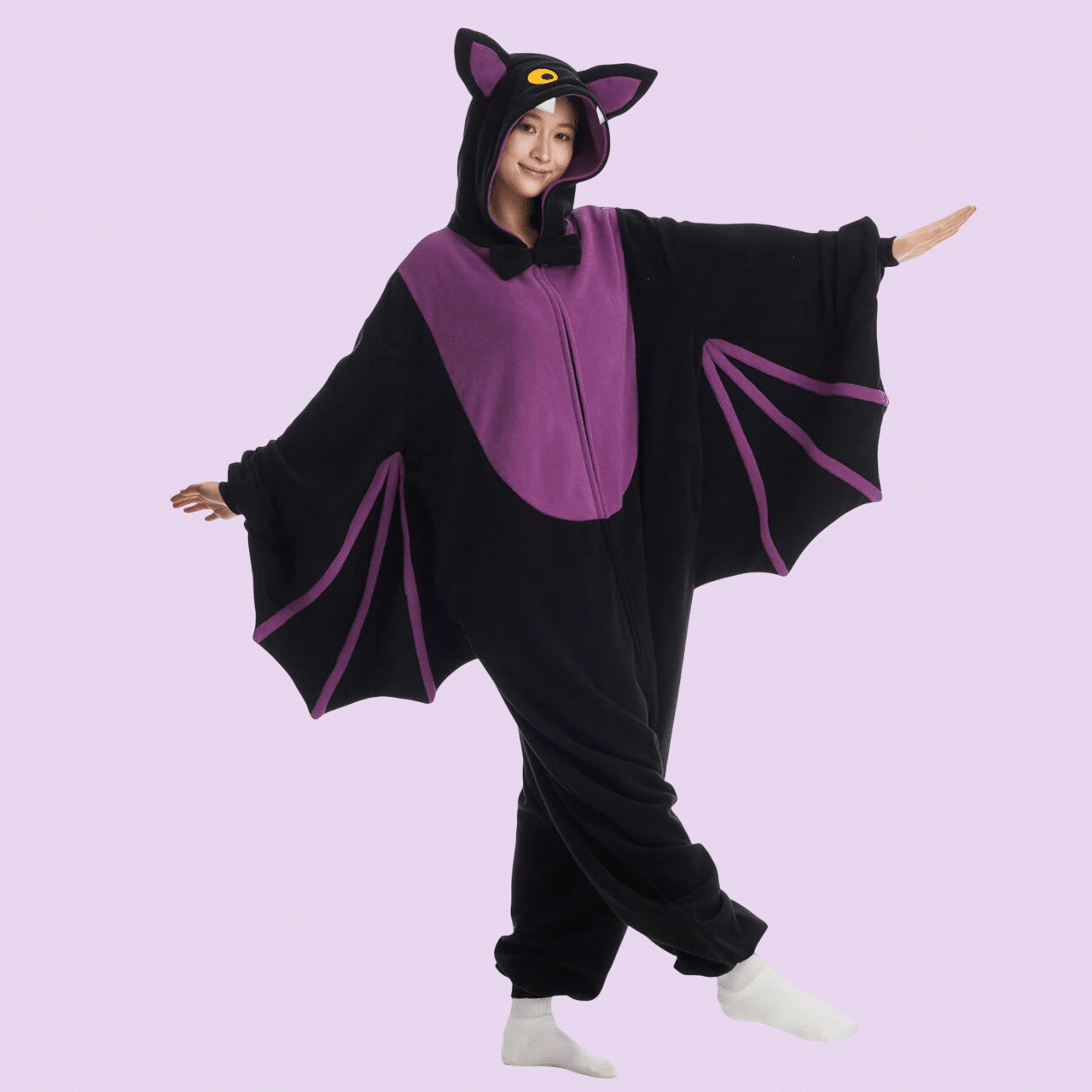 Les manches membranes violettes s’étendent gracieusement pour reproduire fidèlement les ailes de chauve-souris.