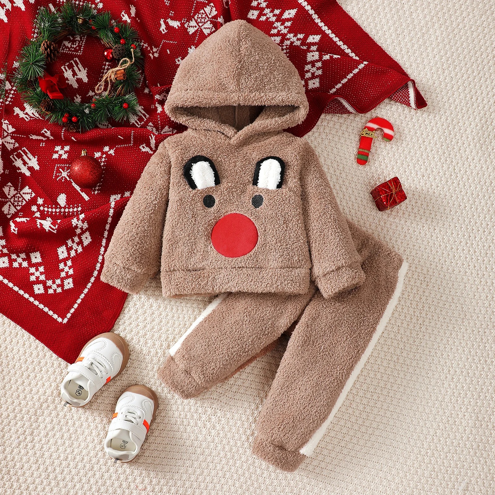 Le haut à capuche présente un visage de renne brodé avec des yeux expressifs et un nez rouge qui fait craquer tous les parents.