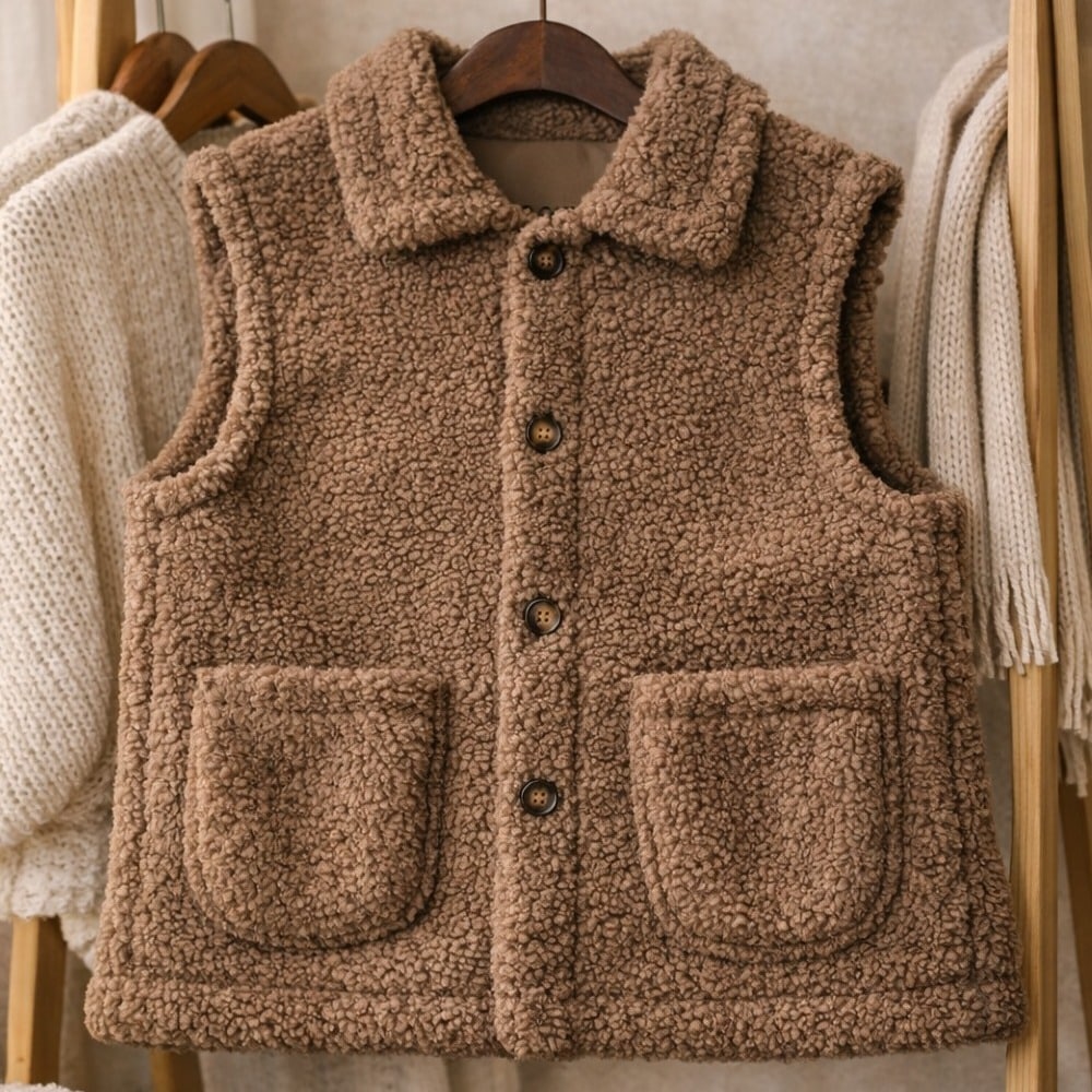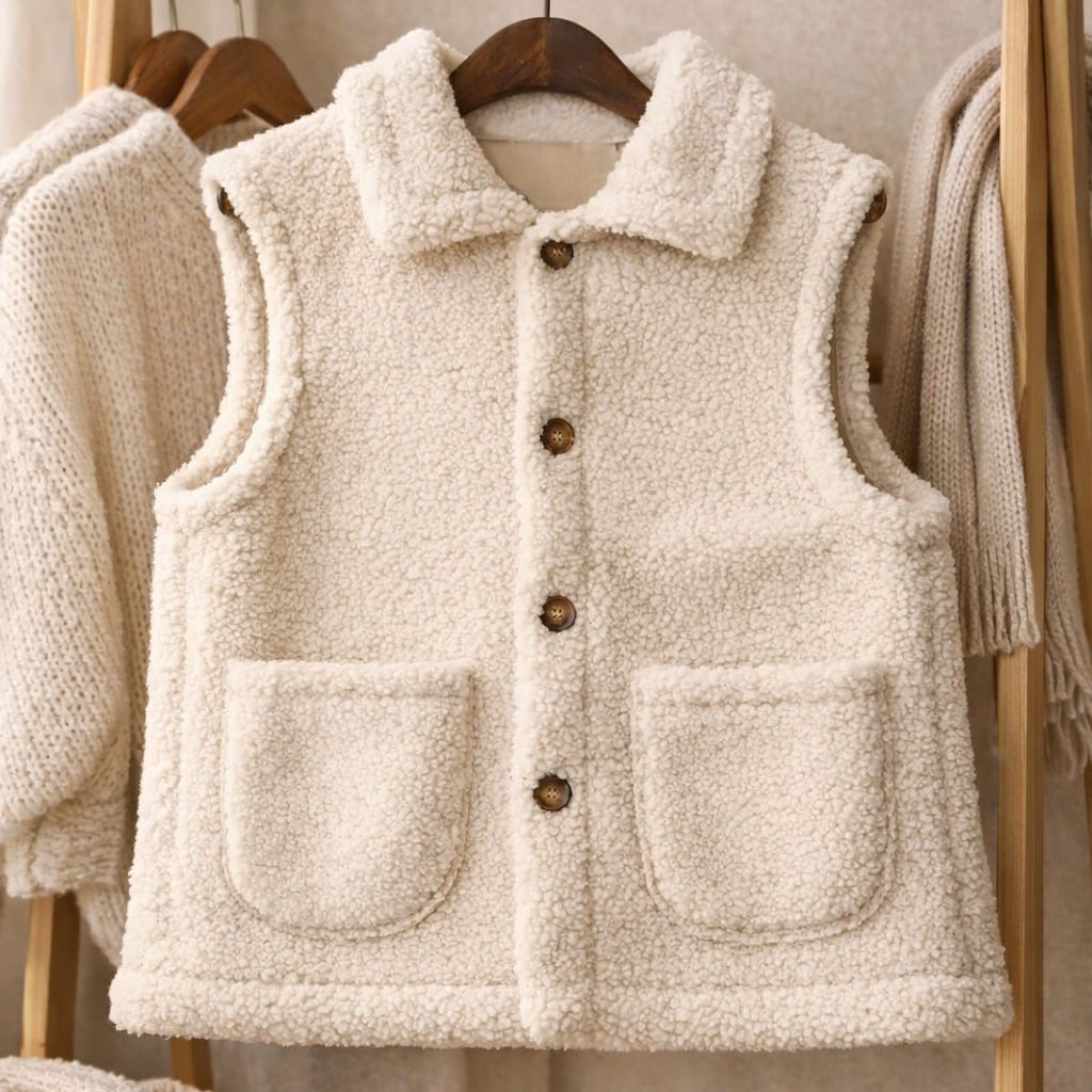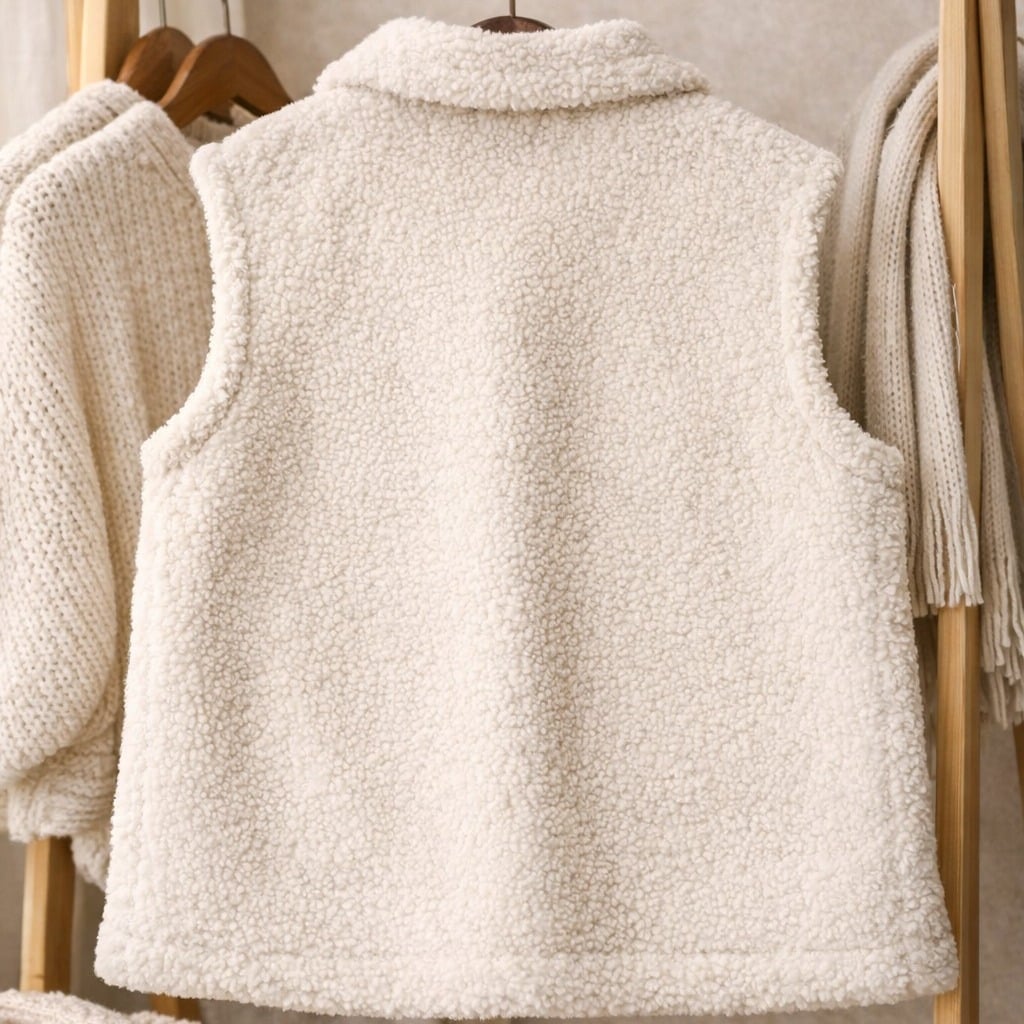 Une texture bouclée qui évoque la tendresse d’un mouton. Ce gilet crème vous enveloppe dans une douceur réconfortante, transformant chaque journée fraîche en moment cocooning.
