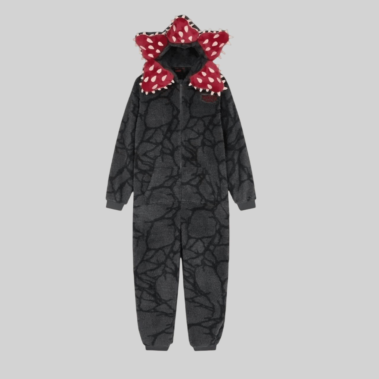La capuche spectaculaire constitue le véritable atout de notre kigurumi demogorgon avec sa forme de fleur carnivore aux pétales rouges ornés de points blancs.