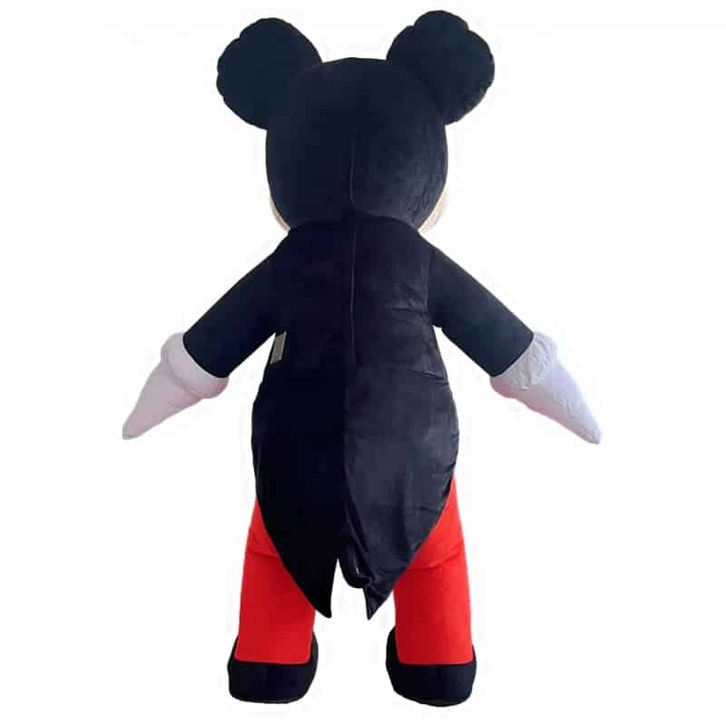 Le costume présente la tenue classique de Mickey : pantalon rouge à boutons blancs, haut noir et nœud papillon jaune vif qui apporte une touche d’élégance au personnage.