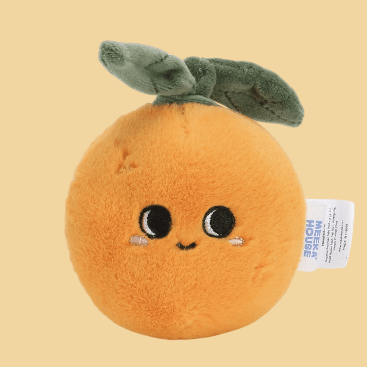 Sa texture douce et moelleuse imite à merveille la peau d’une clémentine, tandis que sa petite feuille verte en tissu posée délicatement sur le dessus ajoute une touche de réalisme saisissante.