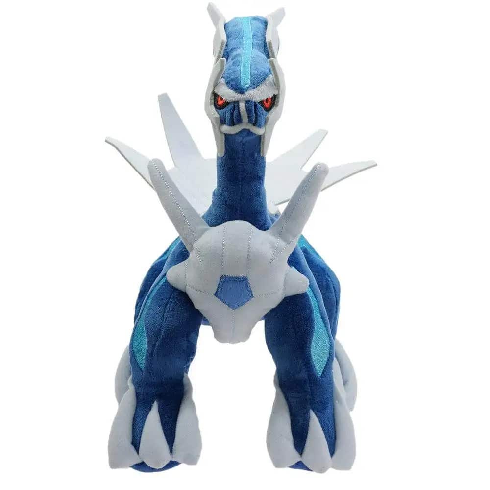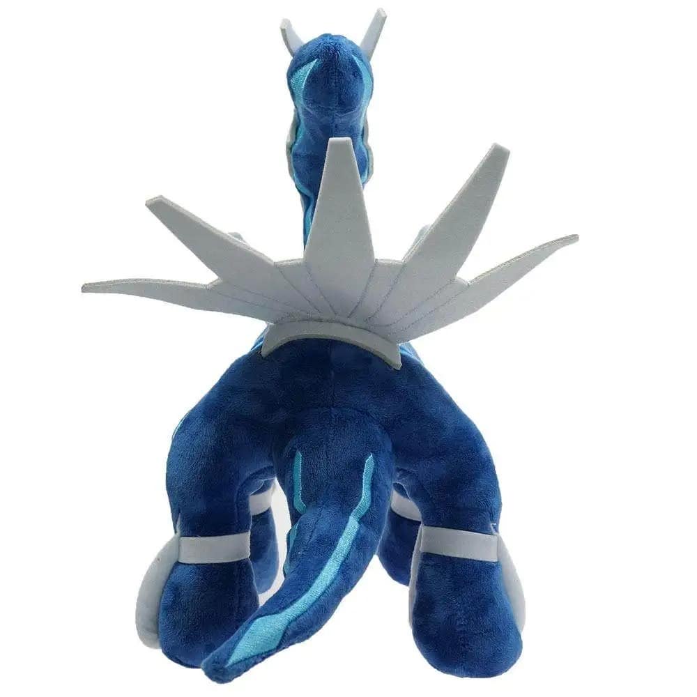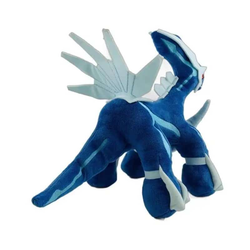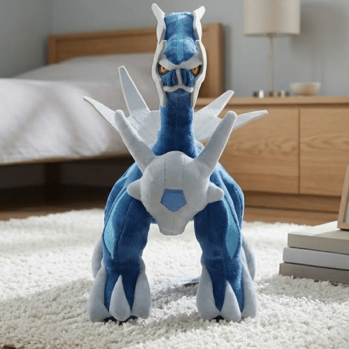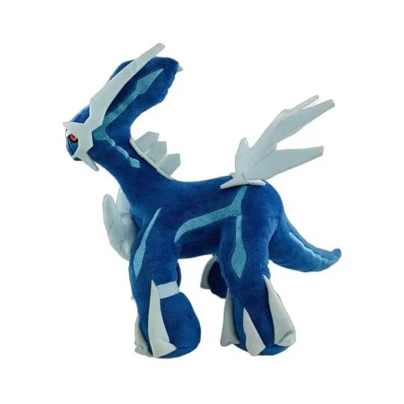 Notre peluche Dialga reproduit fidèlement ce Pokémon légendaire avec ses couleurs emblématiques bleu métallique et blanc nacré.