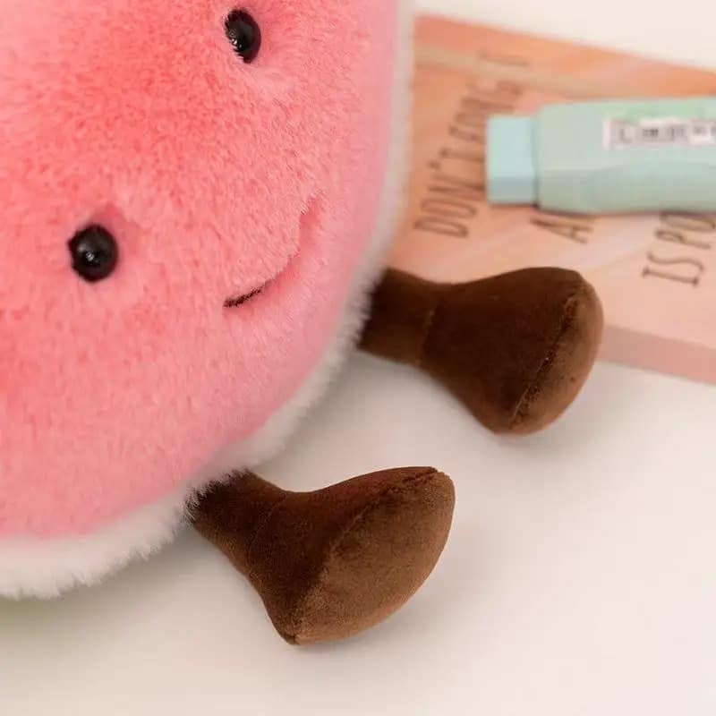 Les petites jambes marron permettent à notre peluche pastèque de tenir debout facilement sur n’importe quelle surface, que ce soit une étagère, un bureau ou une table de chevet.