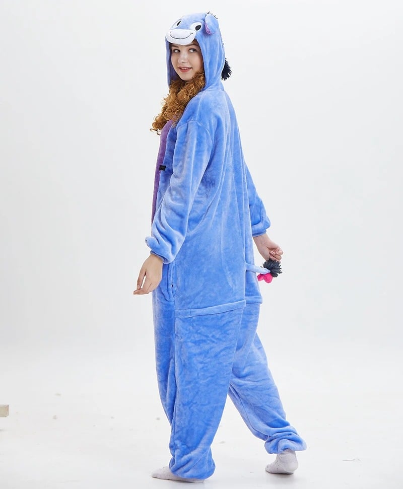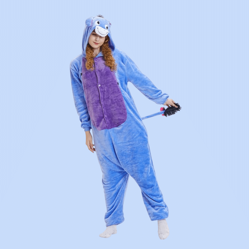 La capuche avec oreilles tombantes reproduit fidèlement l’apparence de Bourriquet avec ses détails brodés qui forment le visage expressif du personnage.