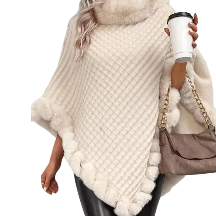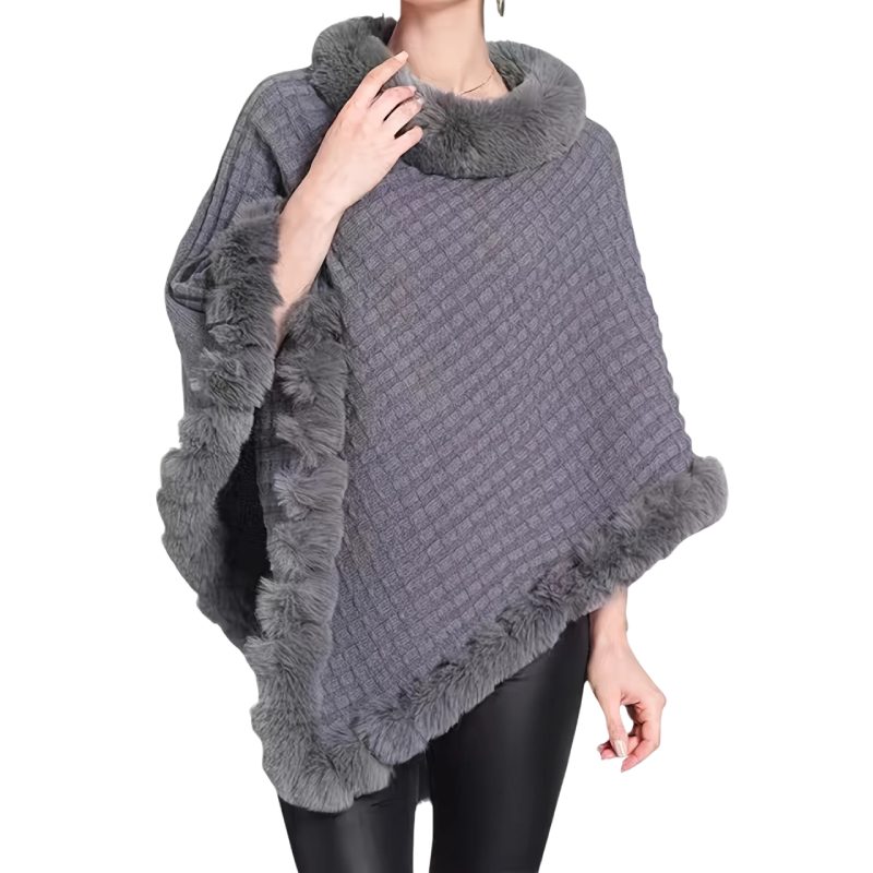 Les bordures en fourrure synthétique encadrent délicatement le col, les manches et le bas du poncho.