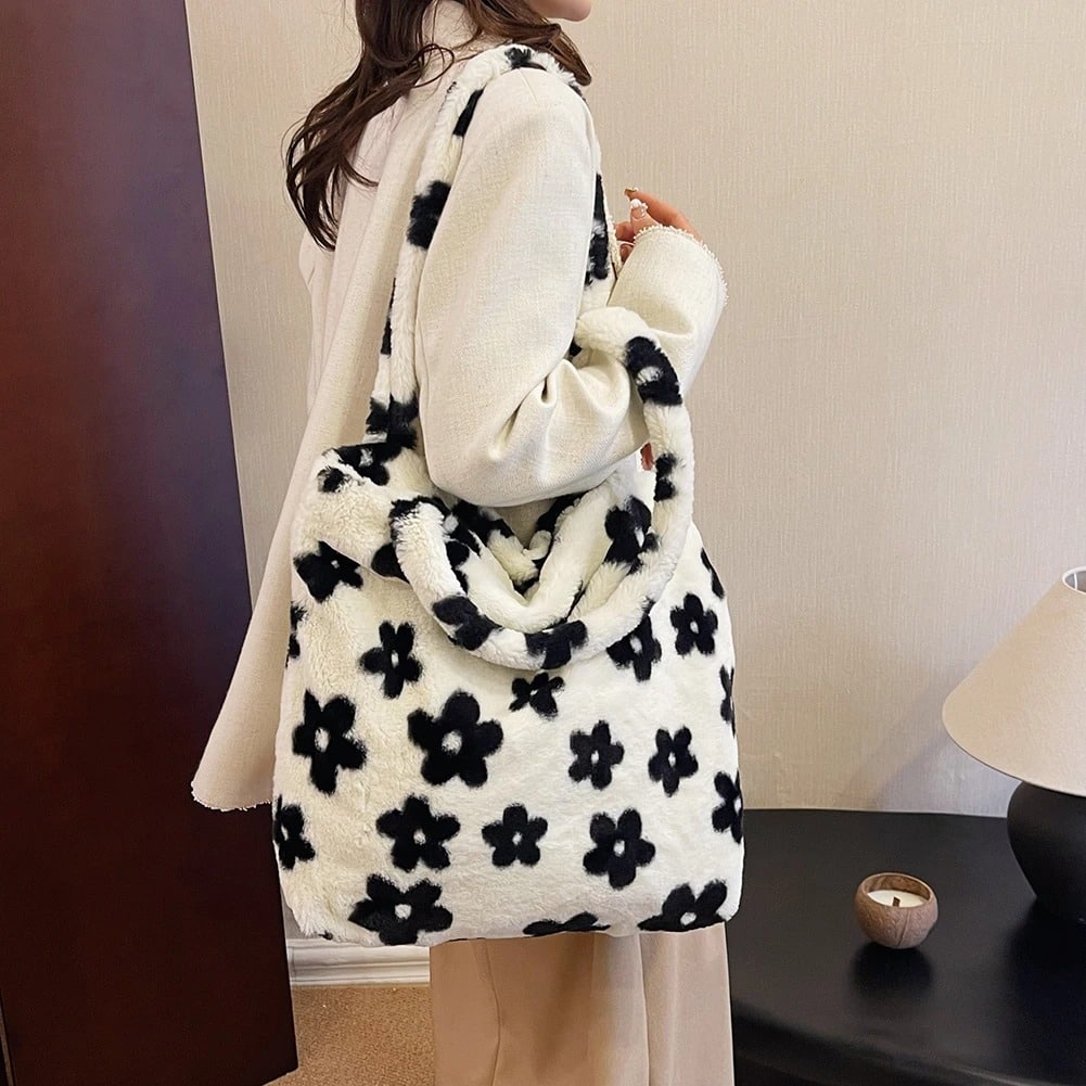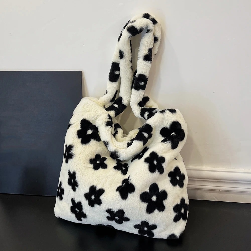 Notre sac moumoute fleurs affiche un motif floral noir sur fond blanc qui apporte une touche élégante à votre quotidien.