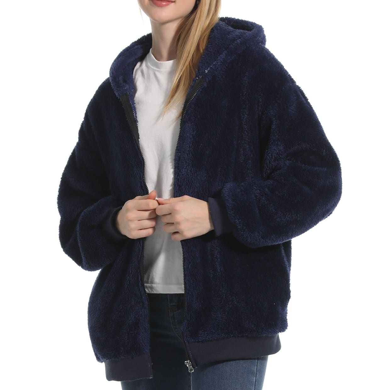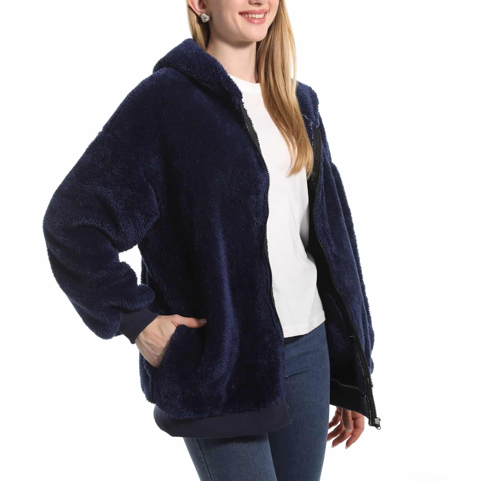Notre veste polaire bleu marine femme vous enveloppe dans une douceur incomparable grâce à sa matière pilou pilou ultra moelleuse.